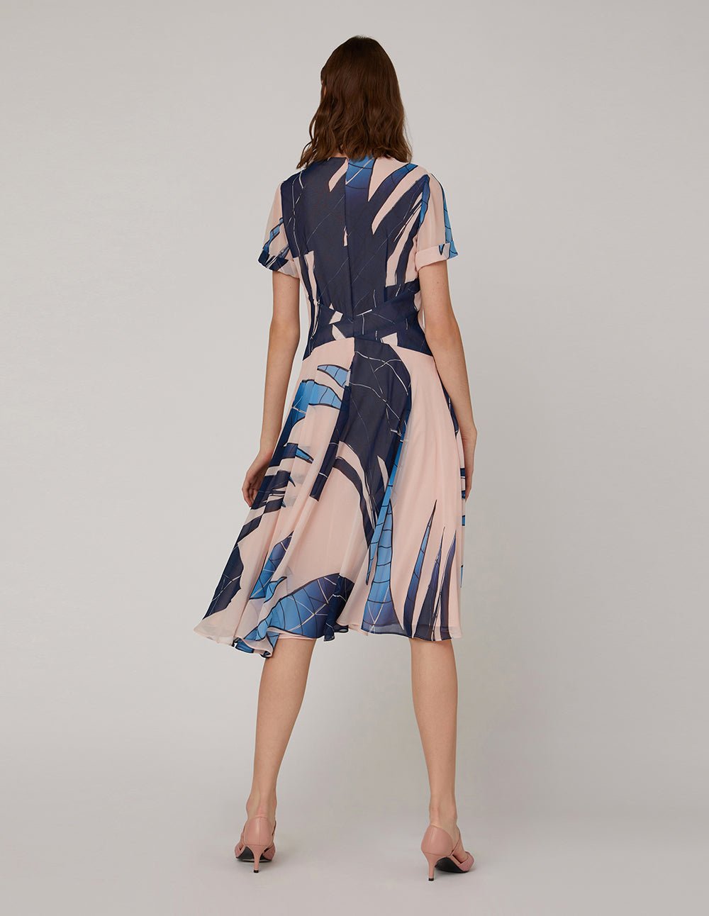 This dress brings dynamic variation with a cross-split design at the waist. A delicate V-shaped neckline and delicate pleated decoration add a touch of elegance and femininity. The large wavy skirt adds a smart and light atmosphere. Irregular art prints make people feel atmospheric and intellectual.