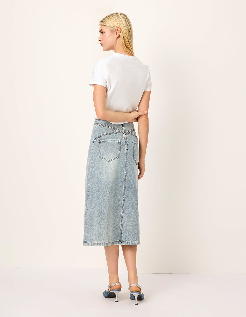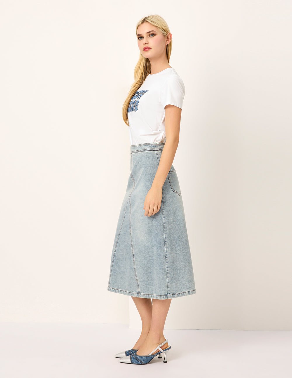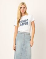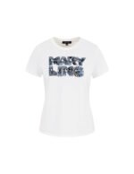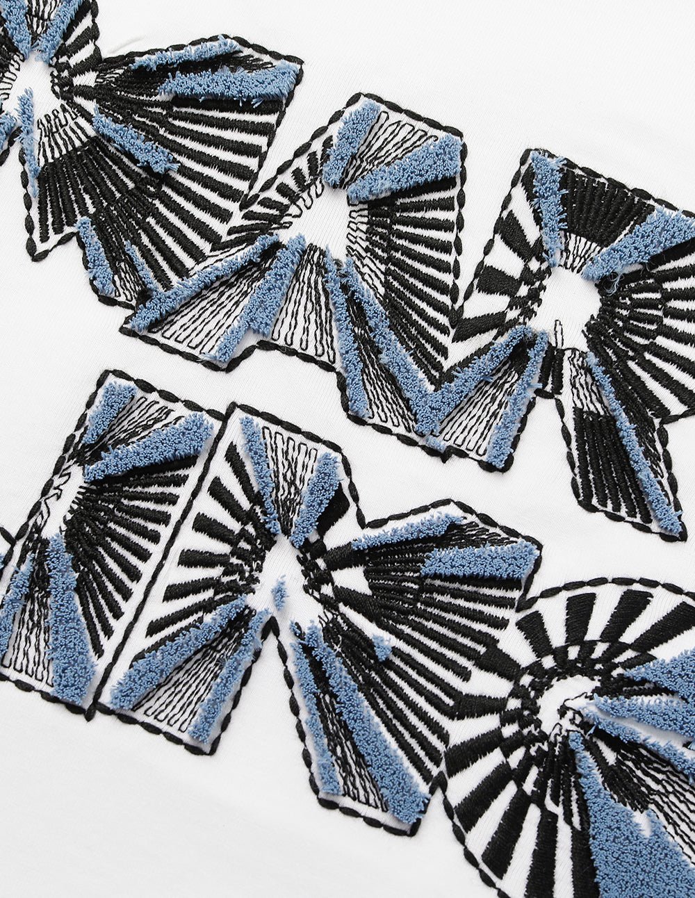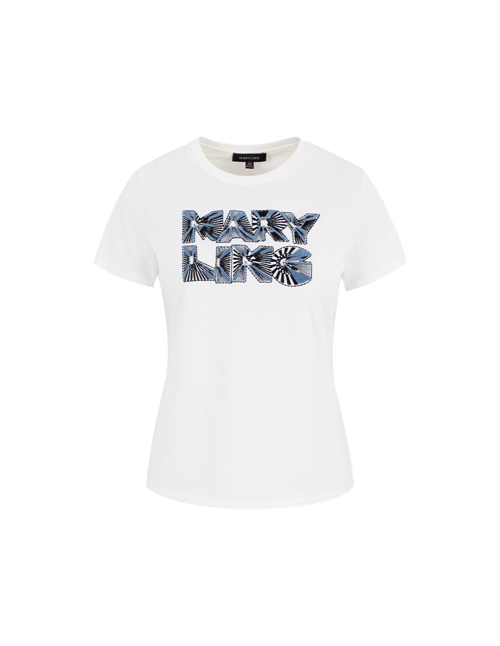 MARYLING’s T-shirt exquisitely combines denim blue with three-dimensional embroidery. giving it a casual yet tough and uninhibited temperament. The embroidery techniques are rich. including delicate flat embroidery. full satin embroidery. and exquisite bead embroidery. From a distance. the denim blue and the three-dimensional embroidery complement each other; look closely. the embroidery texture. silk thread luster. and the exquisite layout of the height difference make the simple T-shirt not simple.
