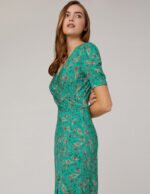 Stretch wrap skirt. The slanted pleats that extend from the neckline to the waist perfectly wrap the bust and waist curves. and the mint green pattern is fashionable and fresh.