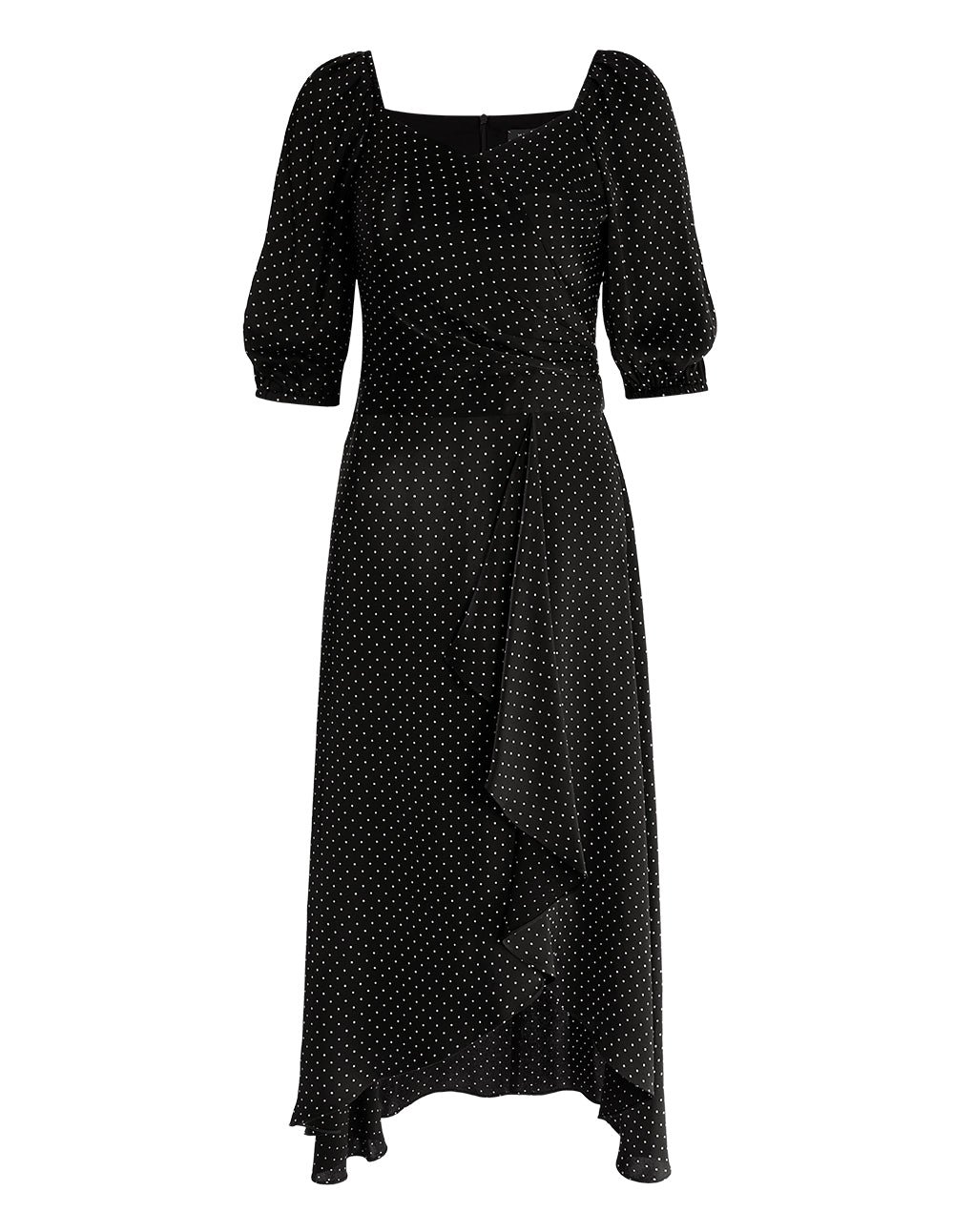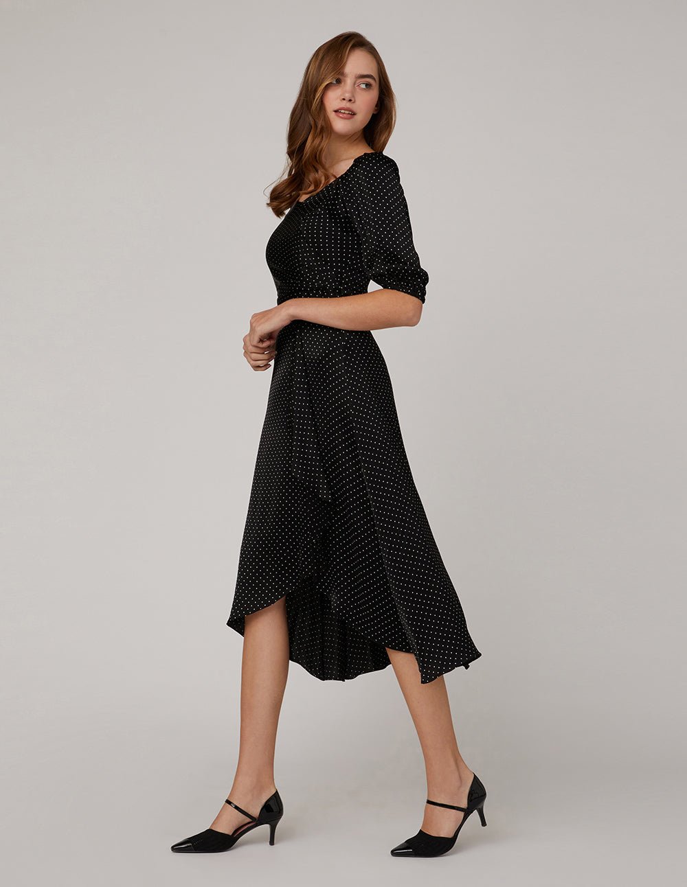 This black polka-dot dress features a V-neck and puffed sleeves in a minimal silhouette for a modern. retro vibe and a ruffled hem for an eye-catching finish. This style easily creates an elegant and romantic femininity.