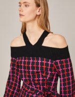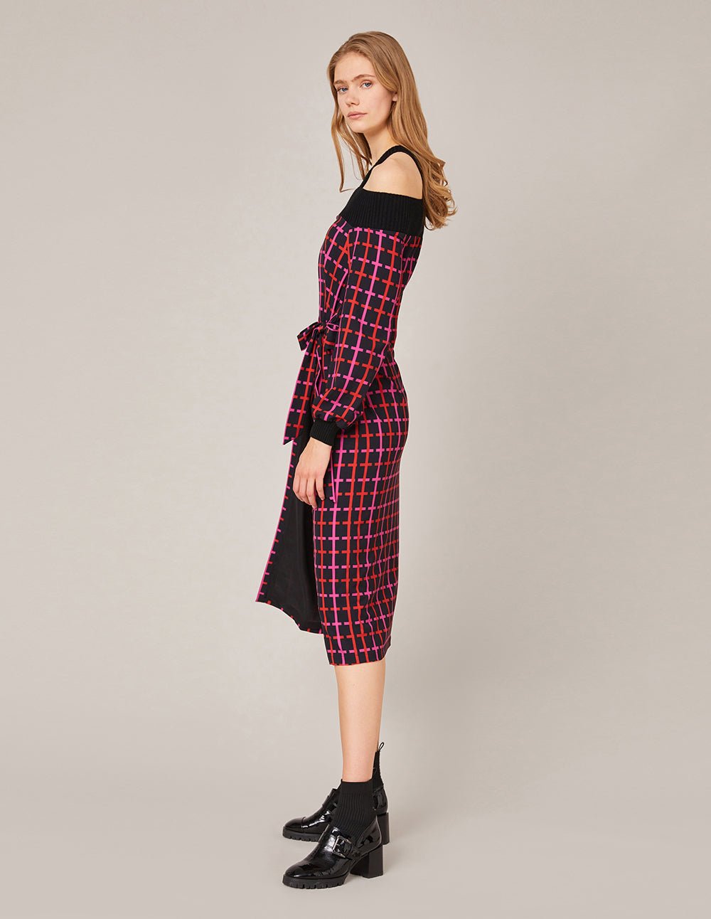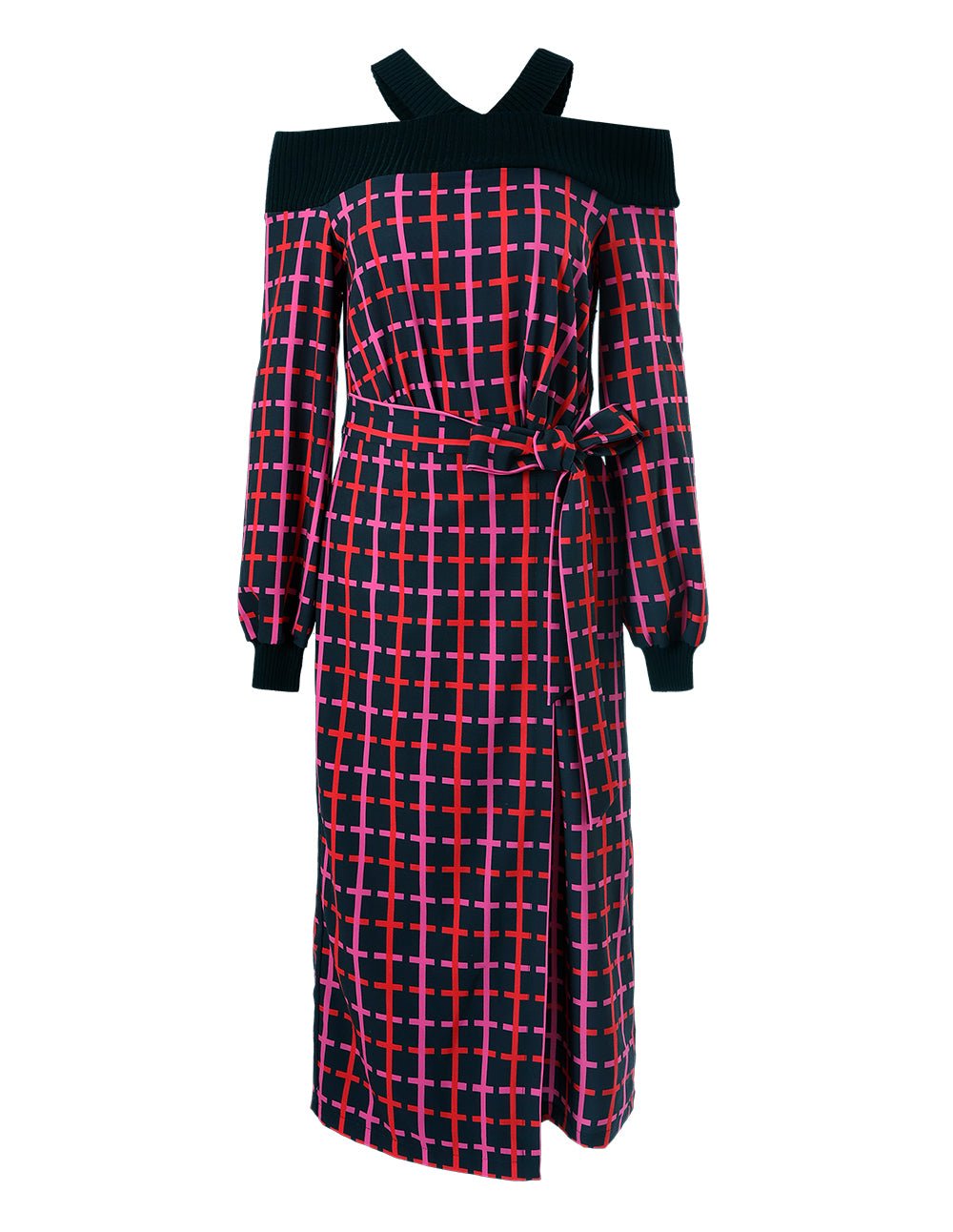 Neon grid pattern. modern and fashionable colors. full of artistic feelingOff-shoulder design. showing a graceful clavicle curveMARYLING stitching. the knit texture is soft and skin-friendly. and the plain weave is light and smoothHigh waist and straight skirt. good proportions. elegant and fashionable