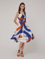 Create Italian elegance with highly visual abstract prints and details. Injecting a strong artistic atmosphere. the contrasting wide shoulder straps overlap with the V-neck to reveal the collarbone. The A-line skirt and rich pleated details bring femininity for a confident and glamorous look. .